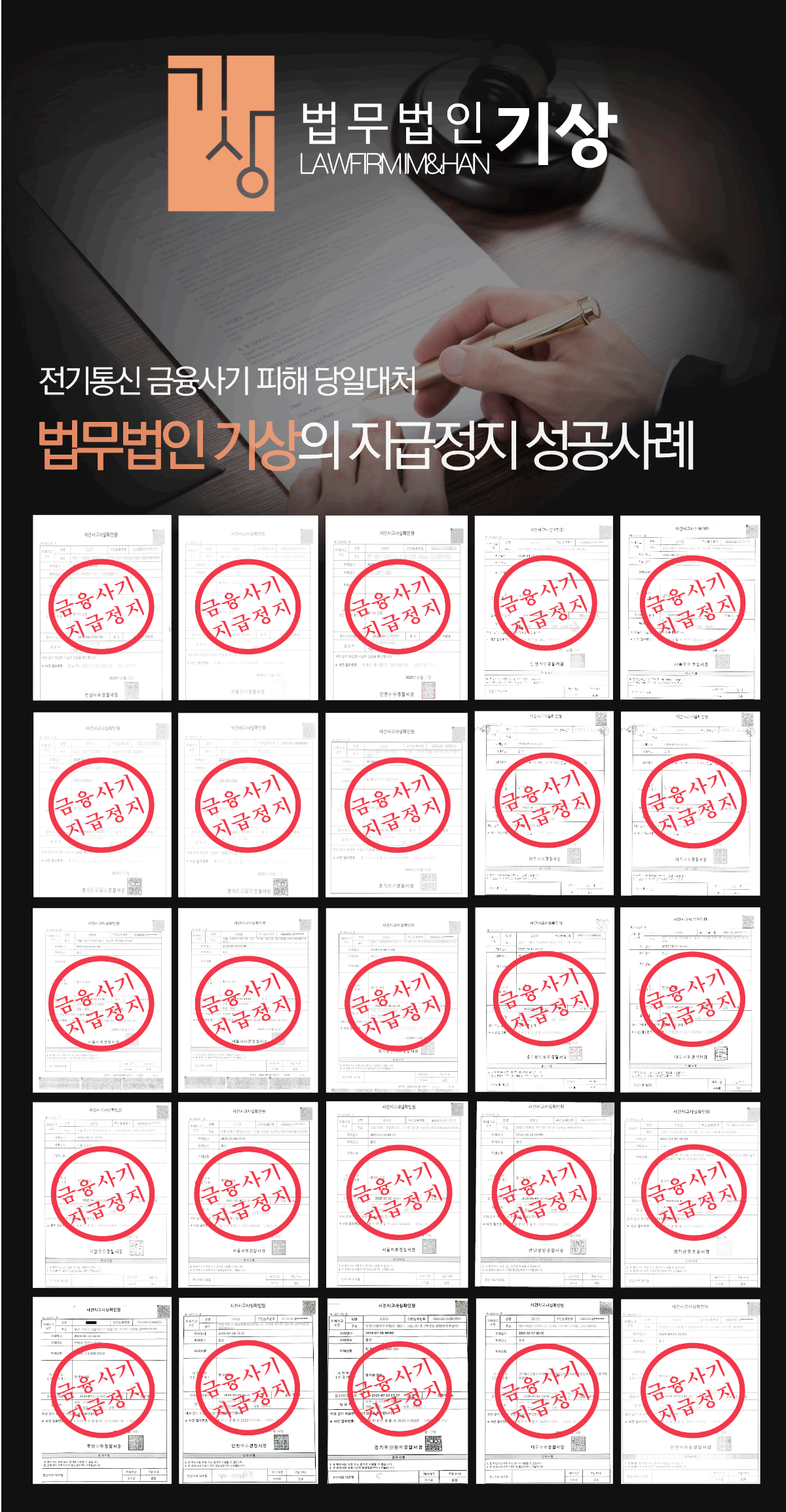 지급정지란, 전기통신금융사기피해환급법에 근거한 피해 구제 절차로, 범죄에 사용된 계좌뿐 아니라 연관된 다른 계좌까지도 일시적으로 정지시킨 뒤, 은행을 통해 남아있는 자금을 회수하는 방식입니다. 이 조치는 초기 대응 속도에 따라 실효성이 크게 달라지므로, 빠른 판단이 중요합니다. 법무법인 氣像에서는 다양한 투자사기 사건에서 지급정지와 형사고소를 병행하여 자금 회수에 성공한 사례를 다수 보유하고 있습니다. 현재 유사한 상황으로 어려움을 겪고 계시다면, 즉시 상담을 요청해 신속하게 대응하시기 바랍니다.